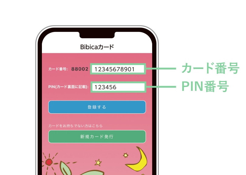 Bibicaカード裏面のカード番号から、先頭の「88002」以降の11桁の数字を入力してください。同じくカード裏面にあるPIN番号の6桁の数字を入力してください。