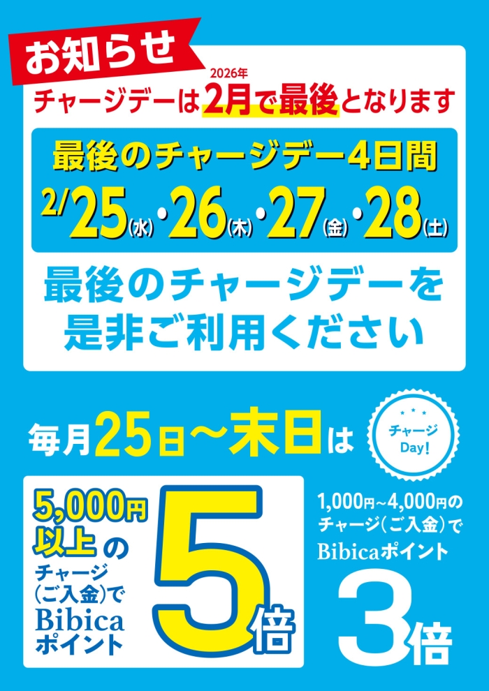 - 【お知らせ】最後のチャージデー4日間!!